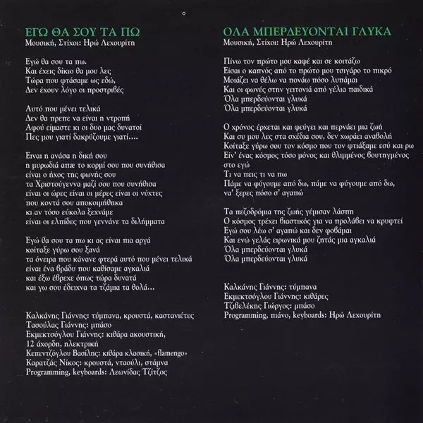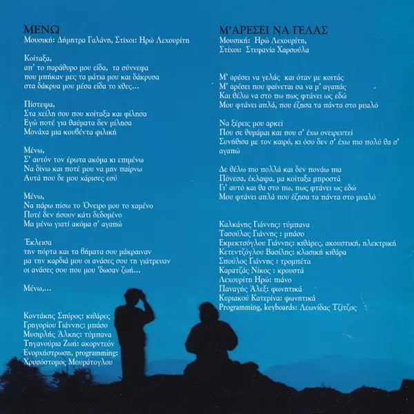 Bass Γιάννης Τασσούλας | Drums Γιάννης Καλκάνης | Electric Guitar, Acoustic Guitar Γιάννης Εκμετζόγλου | Music By, Lyrics By Ηρώ Λεχουρίτη | Programmed By Λεωνίδας Τζίτζος