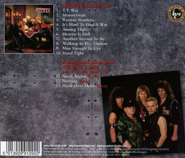 Sedmá LP deska Accept "Russian Roulette" se dostala do uší fanoušků v roce 1986 a okamžitě se v nich pevně usadila. Se skladbami "Heaven Is Hell", "Walking In The Shadows", "TV War" a "Monsterman" přinesla pětice ze Solingenu obvyklé pitoreskní zboží IG Schwermetall - vřele doporučované album pro fanoušky bezdechu!