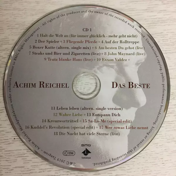 Achim Reichel: Das Beste verze na 2CD v standardní edici. Toto konkrétní vydání vyšlo v Německu ve vydavatelství BMG ve spolupráci s Tangram (2) dne 25. ledna 2019. Album zasahuje do žánrů Rock, Folk, World, & Country a Blues.