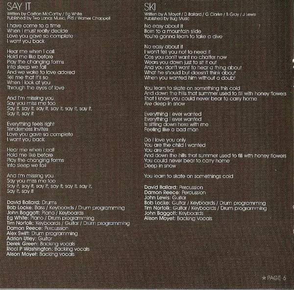 Bass, Keyboards, Drum Programming Bob Locke | Guitar John Lewis (4) | Guitar, Keyboards, Drum Programming Tim Norfolk | Keyboards John Baggott | Percussion Damon Reece, David Ballard | Written-By Alison Moyet, Bruce Gray, David Ballard, Gary Clark, John Lewis (4)