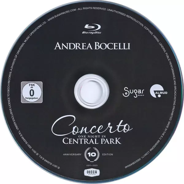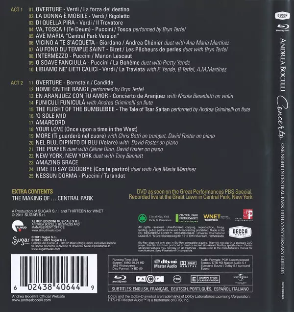 Andrea Bocelli, jeden z nejslavnějších zpěváků všech dob, představuje speciální předělané album Concerto: One Night in Central Park zachycující půvabnou, ale syrovou povahu živého alba, které bylo láskyplně nahráno v New Yorku 15. září 2011. Obsahuje také výjimečná nová provedení, včetně zcela nové nahrávky O Sole Mio...