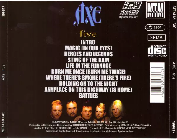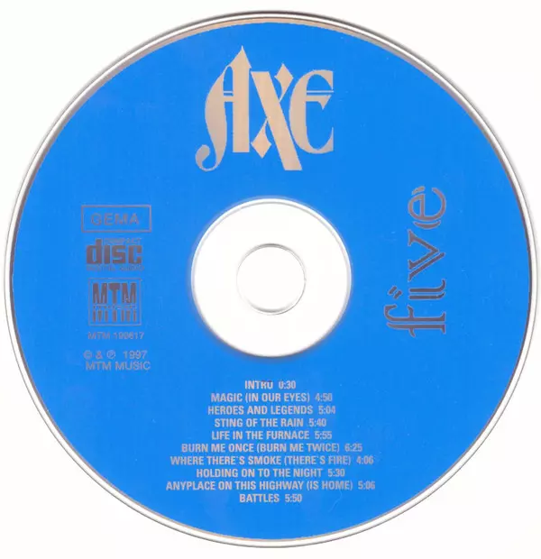 Axe: Five verze na CD v standardní edici. Toto konkrétní vydání vyšlo v Německu ve vydavatelství MTM Music dne 1. června 2009. Album zasahuje do žánrů Rock, Hard Rock, Arena Rock a AOR.