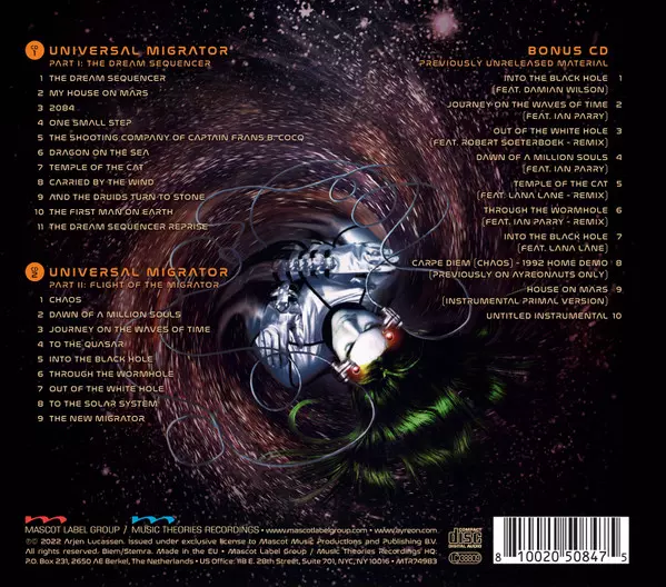 Ayreon: Universal Migrator Part I & II verze na 3CD v remasterované edici. Toto konkrétní vydání vyšlo v Evropě ve vydavatelství Mascot Label Group ve spolupráci s Music Theories Recordings dne 18. listopadu 2023. Album zasahuje do žánrů Rock, Art Rock, Heavy Metal a Symphonic Rock.