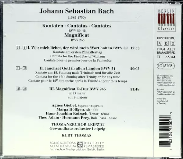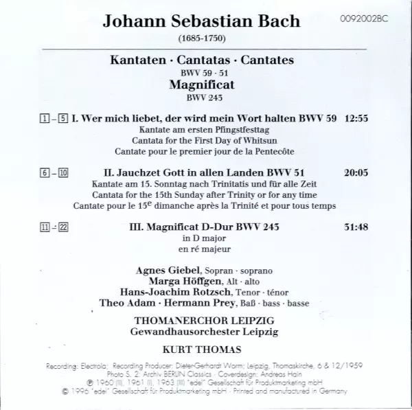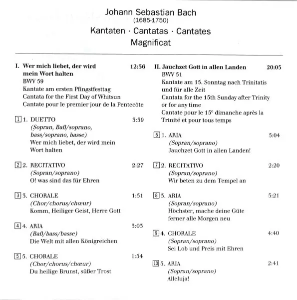 | Titul | Magnificat In D Major BWV 243 / Jauchzet Gott In Allen Landen! BWV 51 / Wer Mich Liebet, Der Wird Mein Wort Halten BWV 59 |