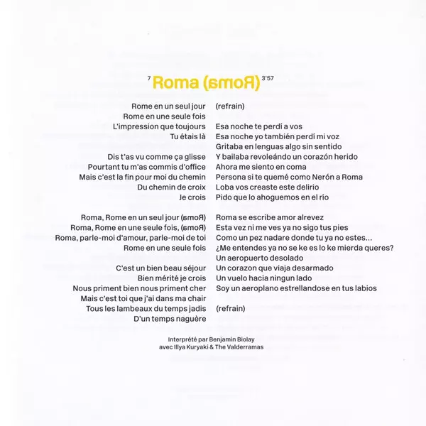| 7 | Benjamin Biolay, Illya Kuryaki & The Valderramas: Roma (amoR) | 3:57 min | |
