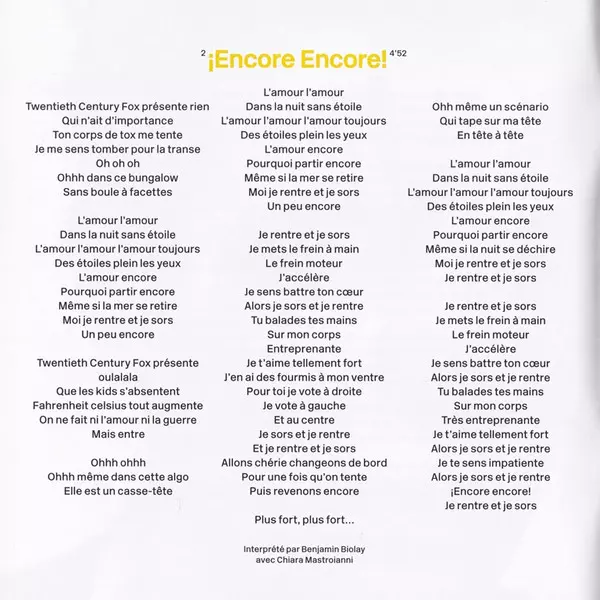 | 2 | Benjamin Biolay, Chiara Mastroianni: ¡Encore Encore! | 4:52 min | |