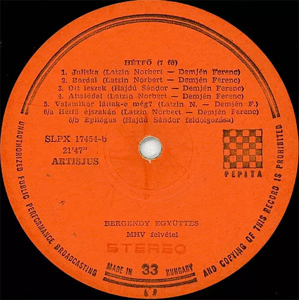 Bergendy: Hétfő verze na vinylu 2LP v standardní edici. Toto konkrétní vydání vyšlo v Maďarsko ve vydavatelství Pepita roku 1973. Album zasahuje do žánrů Rock, Funk / Soul, Progresivní rock a Funk.