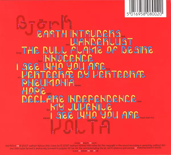 Björk: Volta DIGI verze na CD v digipack edici. Toto konkrétní vydání vyšlo v Velké Británii ve vydavatelství One Little Indian dne 8. ledna 2008.