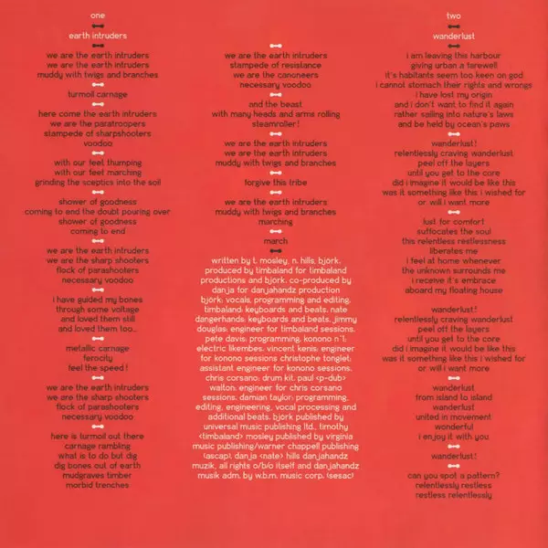 Beats Mark Bell | Brass Bergrún Snæbjörnsdóttir, Björk Níelsdóttir, Brynja Guðmundsdóttir, Dröfn Helgadóttir, Erla Axelsdóttir, Harpa Jóhannsdóttir, Karen J. Sturlausson, Lilja Valdimarsdóttir, Sigrún Jónsdóttir, Sylvia Hlynsdóttir, Særún Pálmadóttir, Valdís Þorkelsdóttir, Vilborg Jónsdóttir, Ása Berglind Hjálmarsdóttir | Edited By, Engineer Michael Pärt | Edited By, Engineer, Programmed By, Noises [Morse Code] Damian Taylor | Engineer [Assistant] Aron Arnarsson | Synth [Bass], Arranged By [Brass], Programmed By, Edited By Björk | Transcription By [Midi Transcription And Part Preparation For Brass] Matt Robertson | Written-By Sjón