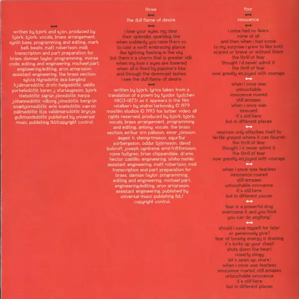 Arranged By [Brass], Programmed By, Edited By Björk | Brass David Bobroff, Einar St. Jónsson, Eiríkur Örn Pálsson, Emil Friðfinnsson, Joseph Ognibene, Oddur Björnsson, Roine Hultgren, Sigurður S. Þorbergsson, Ásgeir H. Steingrímsson | Drums Brian Chippendale | Edited By, Engineer Michael Pärt | Edited By, Engineer, Programmed By Damian Taylor | Engineer Hector Castillo | Engineer [Assistant] Aron Arnarsson, Ichiho Nishiki | Lyrics By [Taken From A Translation Of A Poem By] Fyodor Tyutchev | Transcription By [Midi Transcription And Part Preparation For Brass] Matt Robertson | Vocals Antony (3)