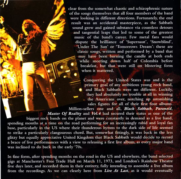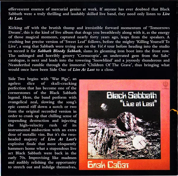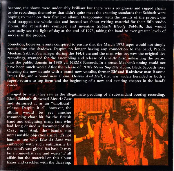 Black Sabbath : Live At Last je album vydané v roce 1980. Album bylo nahráno živě v Hammersmith Odeon v Londýně 26. listopadu 1979. Album produkovali Black Sabbath a Martin Birch. Album bylo nahráno během turné Heaven and Hell. Album bylo prvním živým albem vydaným Black Sabbath . Album bylo komerčně úspěšné a dostalo se na 8. místo v žebříč...