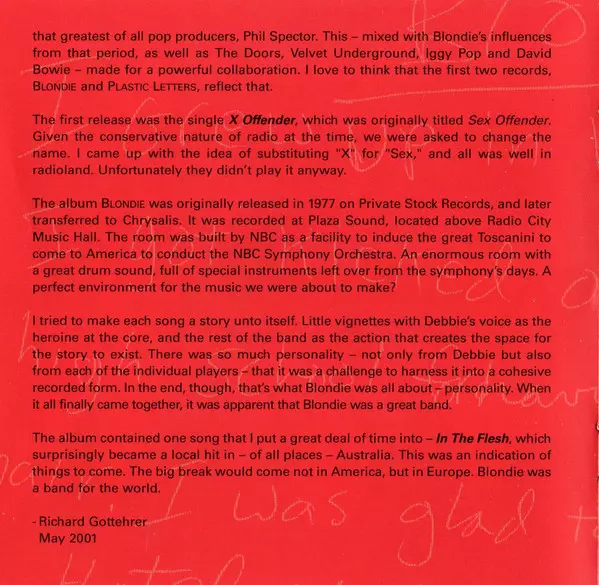 Blondie byla americká rocková skupina, kterou založili zpěvačka Debbie Harry a kytarista Chris Stein. Kapela byla průkopníkem rané americké nové vlny a punkové scény v polovině 70. let. Jejich první dvě alba obsahovala výrazné prvky těchto žánrů, a přestože byla úspěšná ve Spojeném království, Blondie se nikdy nepodařilo prorazit na americké...