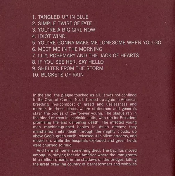 Album Blood on the Tracks, vydané v roce 1975, je jedním z nejuznávanějších alb skupiny Bob Dylan . Album bylo nahráno během pouhých dvou týdnů a působí více odosobněně než některá jiná Dylanova alba. Písně na albu pojednávají o zlomeném srdci a zradě a bývají interpretovány jako Dylanovy úvahy o jeho nevydařeném manželství se Sarou Lowndsovou....