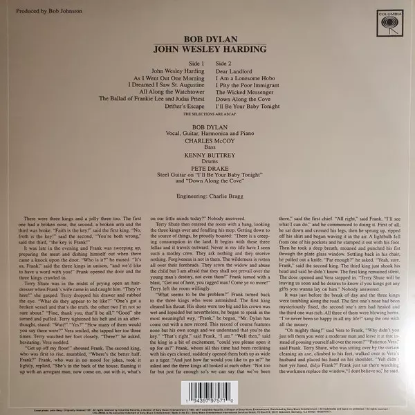 Po třech celosvětových hitech "Another Side Of Bob Dylan", "Highway 61 Revisited" a "Blonde On Blonde" sbalil Bob Dylan v roce 1967 opět svou elektrickou kytaru a zpomalil. Country inspirované dílo "John Wesley Harding" září vynikajícími skladbami, mezi něž patří "I'll Be Your Baby Tonight", "All Along The Watchtower", "I Dreamed I Saw St August...