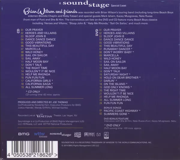 Brian Wilson: Brian Wilson and Friends: A Soundstage Special Event verze na CD/DVD v standardní edici. Toto konkrétní vydání vyšlo v USA ve vydavatelství BMG Rights Management dne 29. července 2016. Album zasahuje do žánrů Rock a Pop.