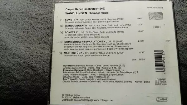 Caspar Rene Hirschfeld: Chamber Music verze na CD v standardní edici. Toto konkrétní vydání vyšlo v Německu ve vydavatelství Col Legno dne 17. září 2003. Album zasahuje do žánrů Klasická hudba a Současná klasická hudba.