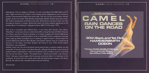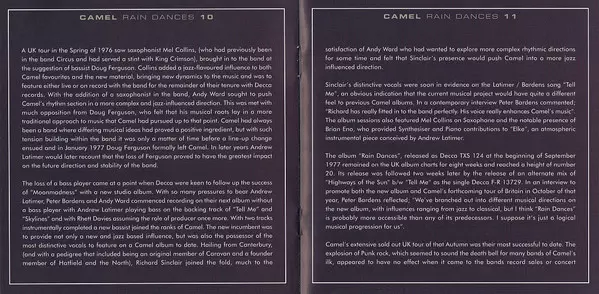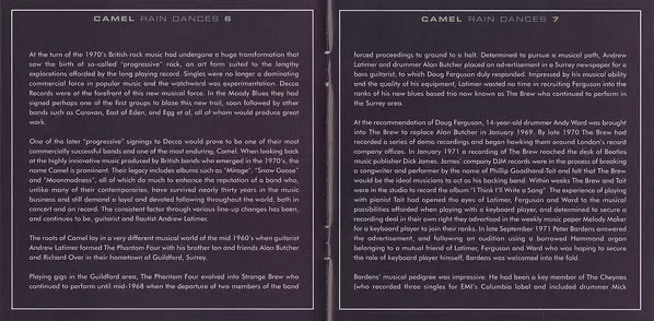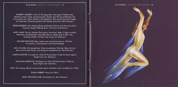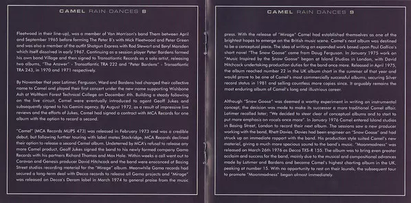 Na svém pátém albu se britské progrockové kombo představuje ve vrcholné formě. Rain Dances je pravděpodobně nejkonzistentnějším albem skupiny Camel. Spoluzakladatel Caravan Richard Sinclar na baskytaru je pro kapelu přínosem a saxofonové a hornové party Mela Collinse patří k vrcholům alba.