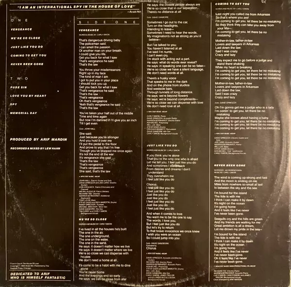 Acoustic Guitar Joe Caro | Backing Vocals Carly Simon | Bass Will Lee | Drums Steve Gadd | Electric Guitar, Soloist David Spinozza | Piano Warren Bernhardt | Synthesizer ["Cat"] Ken Bichel | Words By, Music By Carly Simon