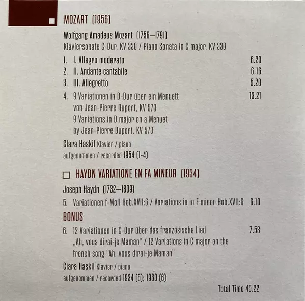 Clara Haskil: Milestones Of A Legend verze na 10CD/Box Set v standardní edici. Toto konkrétní vydání vyšlo v Evropě, USA a Kanadě ve vydavatelství Documents ve spolupráci s The Intense Media dne 19. srpna 2016. Album zasahuje do žánrů Klasická hudba, Barokní hudba, Romantika a Impresionistická hudba.
