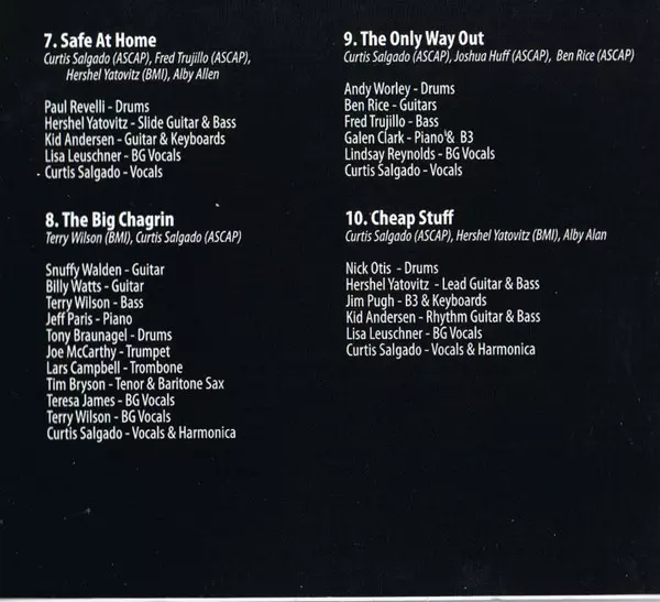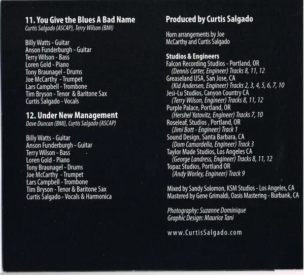 Bass Terry Wilson (3) | Drums Tony Braunagel | Guitar Anson Funderburgh, Billy Watts | Piano Loren Gold | Tenor Saxophone [Tenor Sax], Baritone Saxophone [Baritone Sax] Tim Bryson (2) | Trombone Lars Campbell | Trumpet Joe McCarthy (4) | Vocals, Harmonica Curtis Salgado | Written-By Curtis Salgado, David Duncan (5)