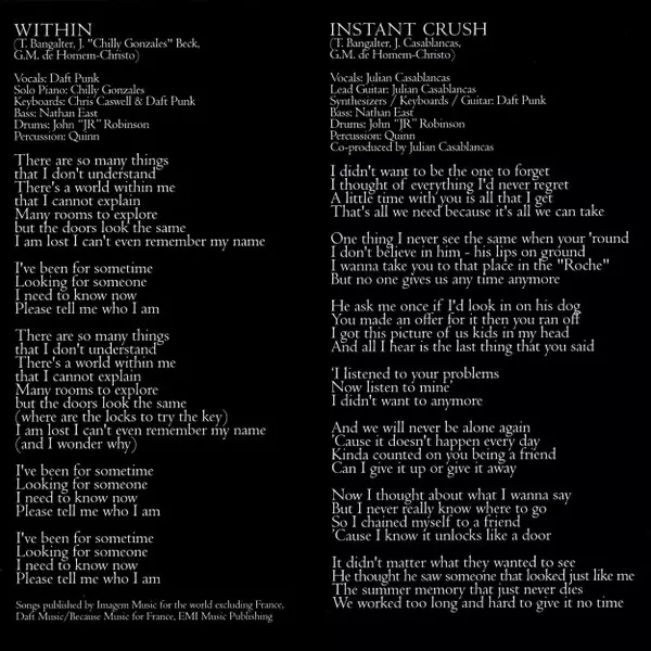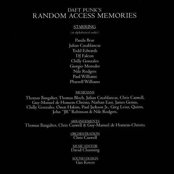 Bass Nathan East | Drums John Robinson (2) | Electric Piano Chris Caswell (2) | Guitar Paul Jackson Jr. | Pedal Steel Guitar [Pedal Steel] Greg Leisz | Synthesizer Daft Punk | Written-By Guy-Manuel de Homem-Christo, Thomas Bangalter