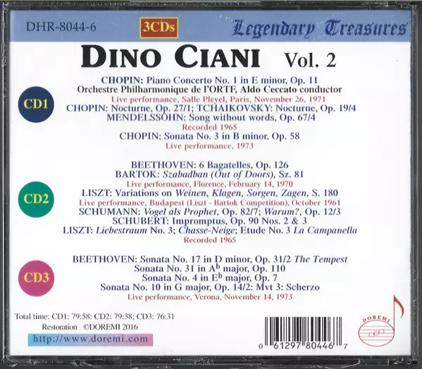 Dino Ciani: Vol. 2 verze na 3CD v remasterované edici. Toto konkrétní vydání vyšlo v USA ve vydavatelství Doremi (2) dne 5. února 2016. Album zasahuje do žánrů Klasická hudba, Modernismus a Romantika.