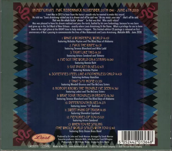 Arranged By Dr. John, Sarah Morrow | Arranged By [Horns] Sarah Morrow | Baritone Saxophone Carl Blouin | Double Bass [Acoustic Bass] Jason Weaver (6) | Drums, Tambourine Herlin Riley | Featuring, Trumpet Nicholas Payton | Guitar Derwin Perkins | Organ [Hammod B3] Ivan Neville | Piano, Vocals Dr. John | Tenor Saxophone Ed Petersen | Trombone Sarah Morrow | Trumpet Barney Floyd | Written-By Louis Armstrong