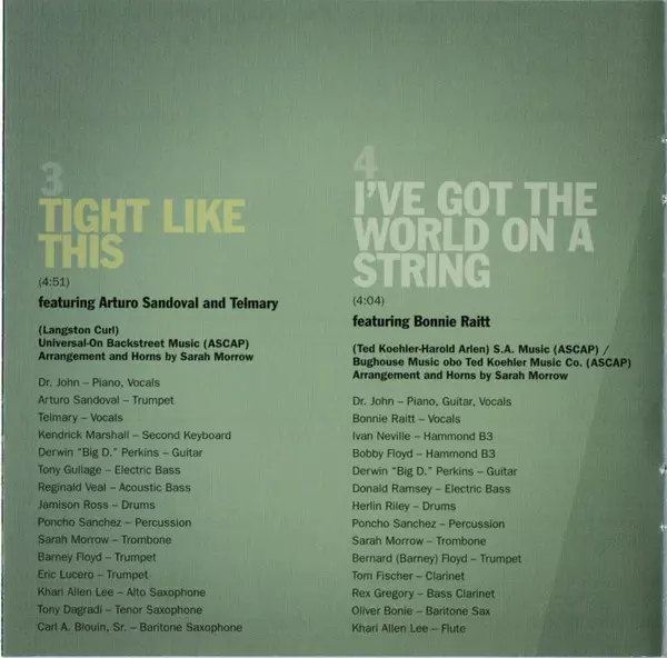 Arranged By Dr. John | Arranged By [Horns] Sarah Morrow | Arranged By [Vocals] The McCrary Sisters | Backing Vocals [The McCrary Sisters] Alfreda McCrary, Ann McCrary, Regina McCrary | Baritone Saxophone Carl Blouin | Double Bass [Acoustic Bass] Jason Weaver (6) | Drums Herlin Riley | Featuring, Backing Vocals The McCrary Sisters | Featuring, Flugelhorn Wendell Brunious | Guitar Derwin Perkins | Organ [Hammod B3] Bobby Floyd | Piano, Vocals Dr. John | Recorded By [The McCrary Sisters] Chad Brown | Tenor Saxophone Ed Petersen | Trombone Sarah Morrow | Trumpet Barney Floyd | Written-By Ben Ellison, Leon Rene, Otis Rene