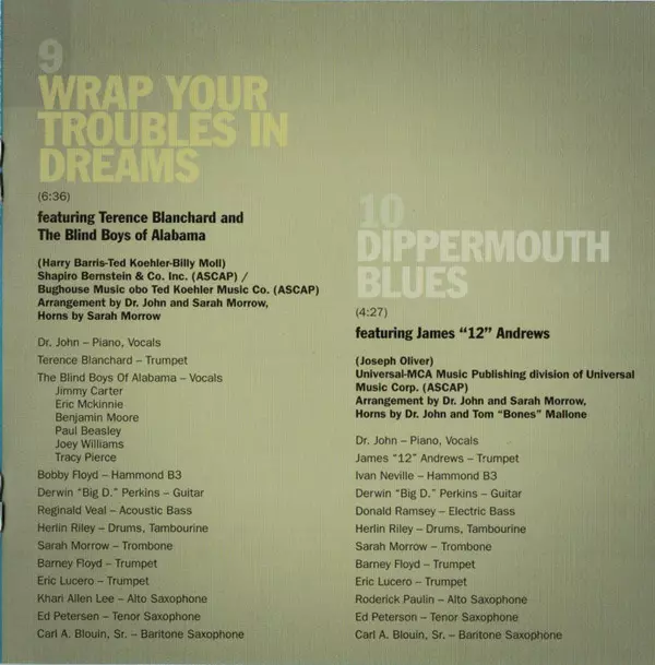 Alto Saxophone Roderick Paulin | Arranged By Dr. John, Sarah Morrow | Arranged By [Horns] Dr. John, Tom Malone | Baritone Saxophone Carl Blouin | Drums, Tambourine Herlin Riley | Electric Bass Donald Ramsey | Featuring, Trumpet James Andrews | Guitar Derwin Perkins | Organ [Hammod B3] Ivan Neville | Piano, Vocals Dr. John | Tenor Saxophone Ed Petersen | Trombone Sarah Morrow | Trumpet Barney Floyd, Eric Lucero | Written-By King Oliver
