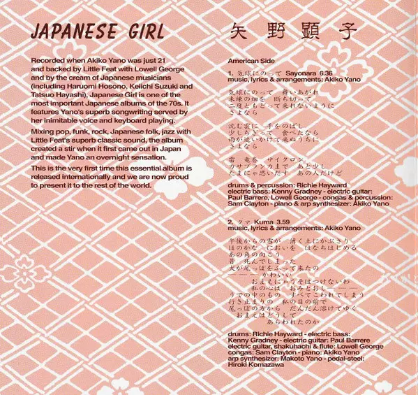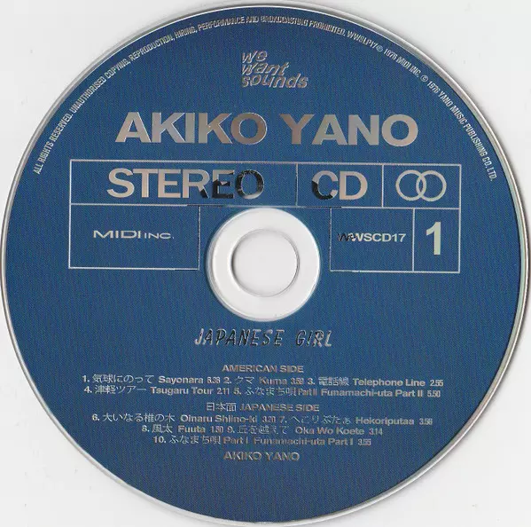 Akiko Yano: Japanese Girl = 日本少女 verze na CD v standardní edici. Toto konkrétní vydání vyšlo v Francii ve vydavatelství Wewantsounds ve spolupráci s MIDI Inc. dne 1. prosince 2023. Album zasahuje do žánrů Rock, Pop, Folk, World, & Country, Jazz, Funk / Soul, Pop Rock, Psychedelický rock, Jazz-Funk a Min'yō.