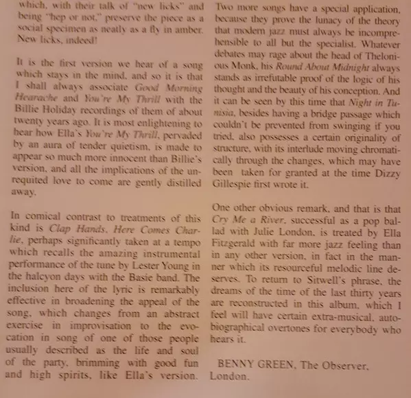 14 titulů z období rozkvětu swingu, které vznikly v letech 1930-1945, znovu a znovu zaznívaly v tanečních sálech a rozhlasových reklamách tohoto světa a které v roce 1961 znovu nahrála a velmi osobitě interpretovala Ella Fitzgerald. Jazzového zpěváka doprovází Herb Ellis (kytara), Gus Johnson (bicí), Stan Levey (bicí), Lou Levy (piano), Wilfred ...