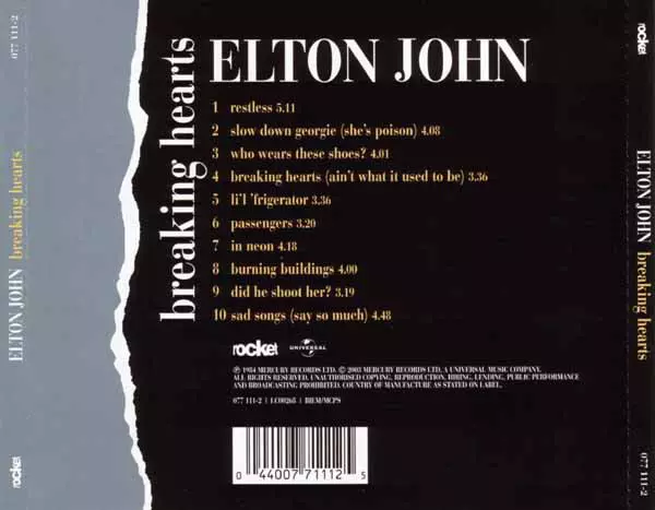 Elton John Album Breaking Hearts, které vyšlo v roce 1984, bylo komerčně úspěšné. Album obsahovalo singly "Sad Songs (Say So Much)", "I'm Still Standing" a "I Guess That's Why They Call It the Blues". Album se dostalo na první místo ve Spojených státech a na druhé místo ve Velké Británii.