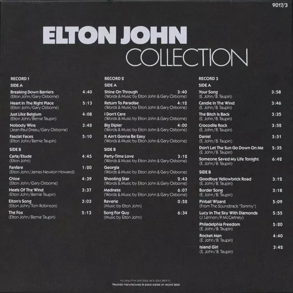 Elton John: Collection verze na vinylu 3LP/Box Set v standardní edici. Toto konkrétní vydání vyšlo v Evropě ve vydavatelství MCA Records. Album zasahuje do žánrů Rock, Pop, Balada a Pop Rock.