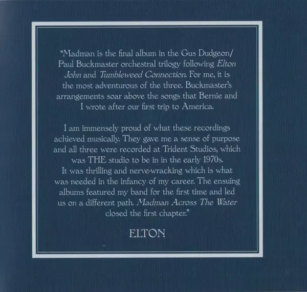 Elton John: Madman Across The Water LTD verze na 2CD v remasterované limitované edici. Toto konkrétní vydání vyšlo v Worldwide ve vydavatelství Rocket Entertainment ve spolupráci s EMI, UMC a DJM Records (2) dne 10. června 2022.