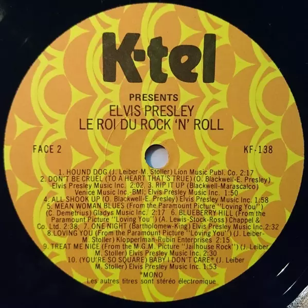 Elvis Presley: Les 40 Plus Grands Succès (Le Roi Du Rock 'N' Roll) verze na vinylu 2LP v standardní edici. Toto konkrétní vydání vyšlo v Kanadě ve vydavatelství K-Tel roku 1976. Album zasahuje do žánrů Rock, Pop a Rock & Roll.