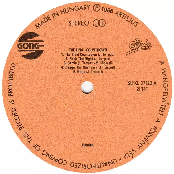 Europe: The Final Countdown verze na vinylu LP v standardní edici. Toto konkrétní vydání vyšlo v Maďarsko ve vydavatelství Gong roku 1986.