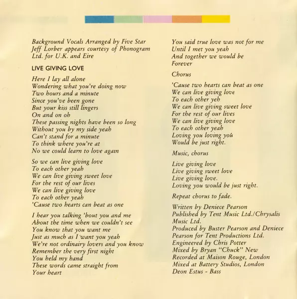 Arranged By [Backing Vocals] Dennis Lambert, Five Star | Arranged By, Keyboards, Programmed By Claude Gaudette | Coordinator [Assistant Producer] Marrianne Pellicci | Drums Mike Baird | Guitar Dann Huff | Mixed By Jeremy Smith (2), Mike Tacci | Producer Dennis Lambert | Recorded By Jeremy Smith (2) | Saxophone Dave Koz | Written-By Bill Hagans, Cliff Dawson, Lionel Job