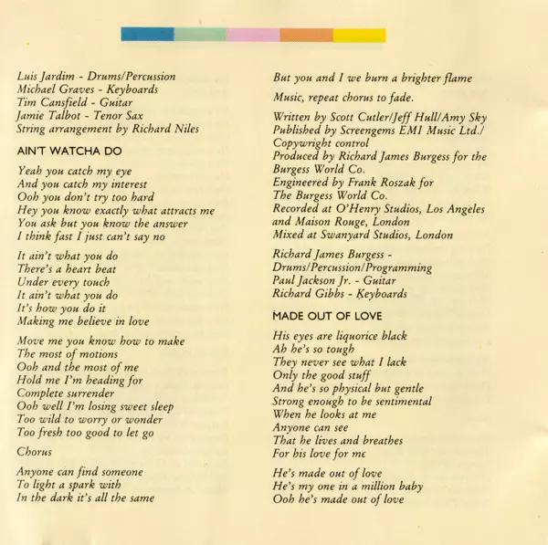 Drums, Percussion, Programmed By Richard James Burgess | Engineer Frank Roszak | Guitar Paul Jackson Jr. | Keyboards Richard Gibbs | Producer Richard James Burgess | Saxophone Tom Scott | Written-By Joey Gallo, Pamela Phillips Oland, Wardell Potts
