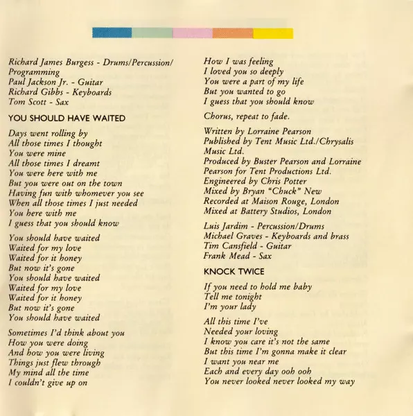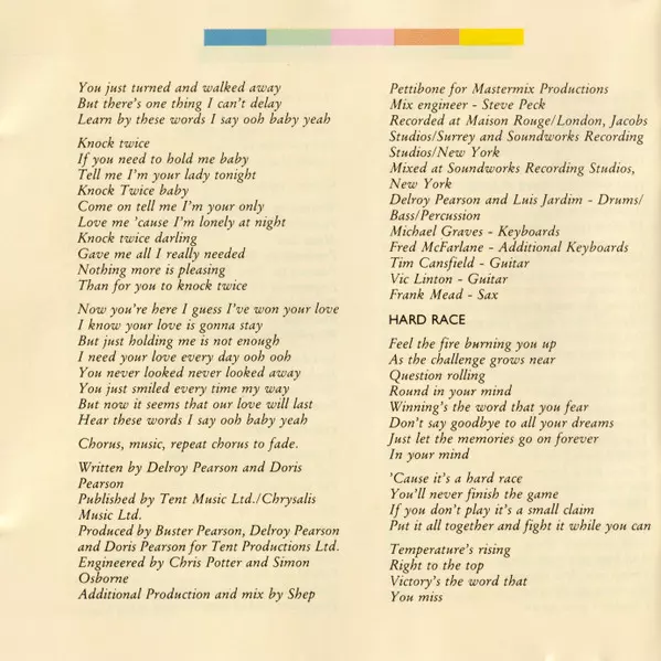 Drums, Bass, Percussion Delroy Pearson, Luis Jardim | Engineer Christopher Marc Potter, Simon Osborne | Guitar Tim Cansfield, Vic Linton | Keyboards Michael Graves | Keyboards [Additional] Fred McFarlane | Mixed By Steve Peck | Producer Buster Pearson, Delroy Pearson, Doris Pearson | Producer [Additional], Mixed By [Additional] Shep Pettibone | Saxophone Frank Mead | Written-By Delroy Pearson, Doris Pearson