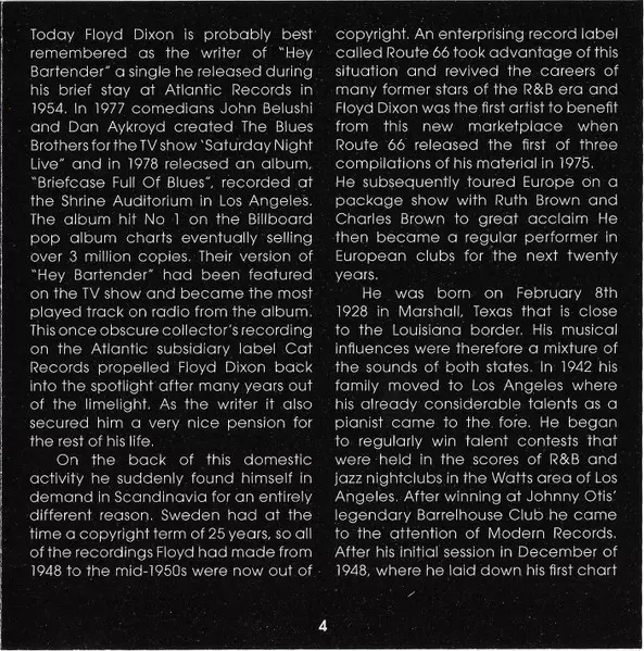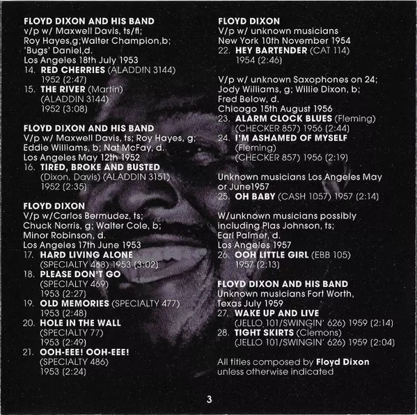 | Bass Johnny Miller (2) | Drums Ellis Walsh | Guitar Johnny Moore (2), Oscar Moore | Tenor Saxophone Maxwell Davis | Vocals, Piano Floyd Dixon | |||