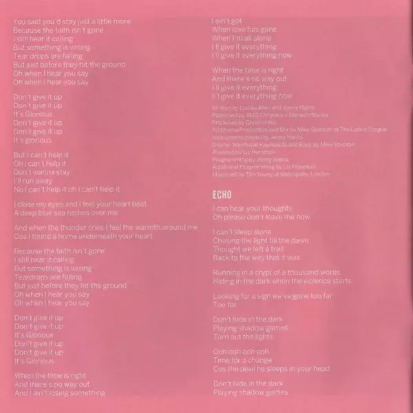 Bass Mike Spencer | Bass [Additional] Jonny Harris (2) | Co-producer Mike Spencer | Drum Programming Jonny Harris (2) | Drums Mike Spencer | Keyboards [Additional] Mike Spencer | Mixed By Mike Spencer | Mixed By [Additional] Liz Horsman | Percussion Iyiola Babalola | Piano Darren Lewis | Producer [Additional] Future Cut | Programmed By Darren Lewis, Iyiola Babalola | Programmed By [Additional] Jonny Harris (2), Liz Horsman | Written-By Jonny Harris (2), Louisa Rose Allen, Toby Gad