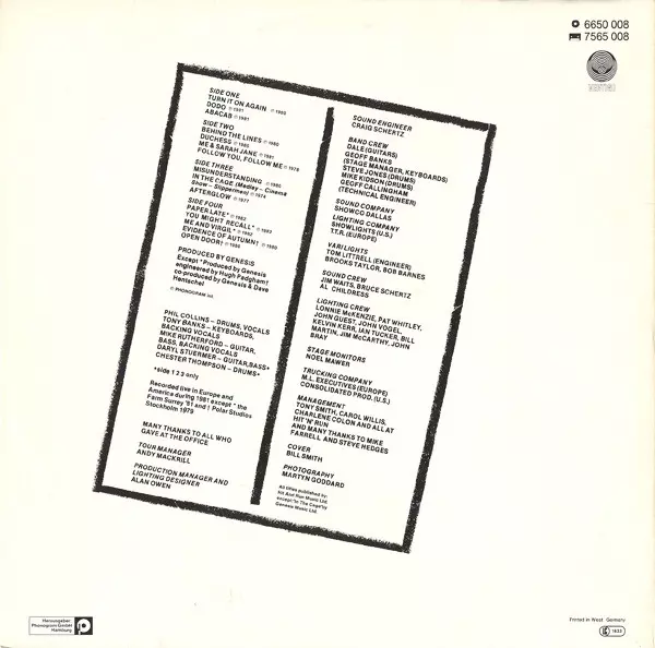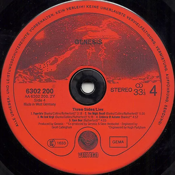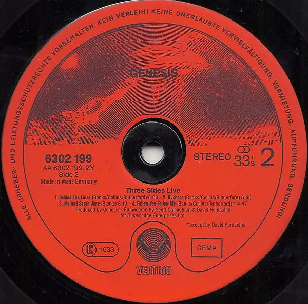 Genesis: Three Sides Live verze na vinylu 2LP v standardní edici. Toto konkrétní vydání vyšlo v Německu ve vydavatelství Vertigo dne 31. května 1982.