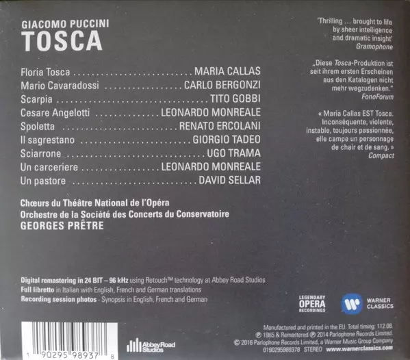 Maria Callas: Tosca DLX verze na 2CD v deluxe remasterované edici. Toto konkrétní vydání vyšlo v Evropě ve vydavatelství Warner Classics ve spolupráci s Abbey Road Studios dne 23. září 2016. Album zasahuje do žánrů Klasická hudba a Opera.