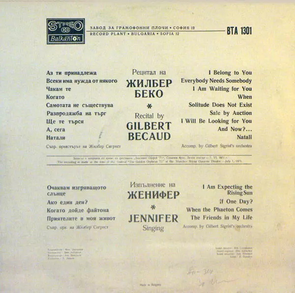 | Upřesnění | Bulgarian Compilation · Cyrillic cover 1971 press |