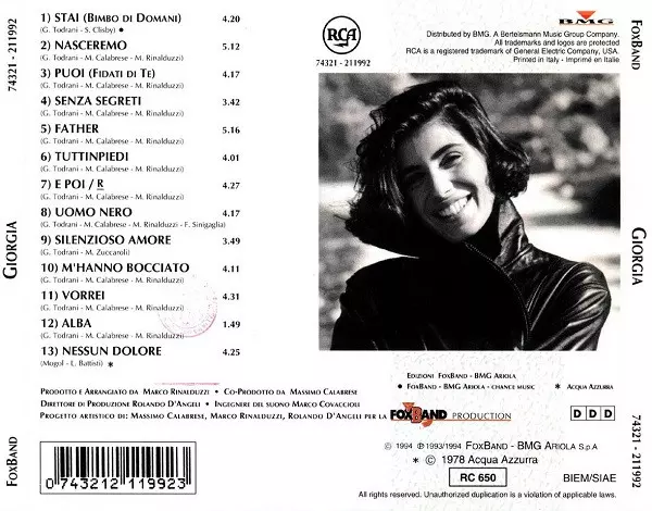 Giorgia: Giorgia verze na CD v standardní edici. Toto konkrétní vydání vyšlo v Itálii ve vydavatelství Fox Band ve spolupráci s RCA a BMG dne 30. června 1998. Album zasahuje do žánrů Pop, Balada a Europop.