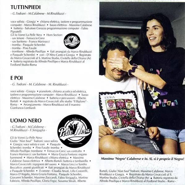 Arranged By [Wind Instruments] Marco Rinalduzzi, Pasquale Schembri | Backing Vocals [Il Corone] Alberto Bartoli, Alfredo Posillipo, Claudia Arvati, Fabio Sinigaglia, Giorgia, Giovanni Schembri, Giulio Todrani, Gloria Fegiz, Lilla Costarelli, Marco D'Angelo, Marco Rinalduzzi, Maria Grazia Fontana, Martino Fabrizio, Massimo Calabrese, Massimo Zuccaroli, Pasquale Schembri, Susanna Stivali | Engineer [Assistant] Marco Lecci, Sandro Beccafico | Engineer [Recording] Mark Covaccioli | Performer Gli Io Vorrei La Pelle Nera | Performer [Gli Io Vorrei La Pelle Nera], Alto Saxophone [Sax Contraalto] Ferruccio Corsi | Performer [Gli Io Vorrei La Pelle Nera], Baritone Saxophone Franco Marinacci | Performer [Gli Io Vorrei La Pelle Nera], Drums, Tambourine Alberto Bartoli | Performer [Gli Io Vorrei La Pelle Nera], Electric Bass Massimo Calabrese | Performer [Gli Io Vorrei La Pelle Nera], Electric Guitar Marco Rinalduzzi | Performer [Gli Io Vorrei La Pelle Nera], Lead Vocals Giulio Todrani | Performer [Gli Io Vorrei La Pelle Nera], Lead Vocals, Backing Vocals Giorgia | Performer [Gli Io Vorrei La Pelle Nera], Organ [Hammond] Maria Grazia Fontana | Performer [Gli Io Vorrei La Pelle Nera], Trombone Alfredo Posillipo | Performer [Gli Io Vorrei La Pelle Nera], Trumpet Pasquale Schembri, Pino Favale | Recorded By [Drums] Alfredo Posillipo, Marco Rinalduzzi | Written-By Fabio Sinigaglia, Giorgia Todrani, Marco Rinalduzzi, Massimo Calabrese