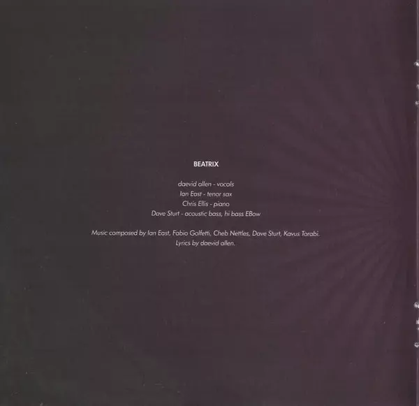 Acoustic Bass, Bass [Hi Bass EBow] Dave Sturt | Piano Chris Ellis (16) | Tenor Saxophone Ian East | Vocals Daevid Allen