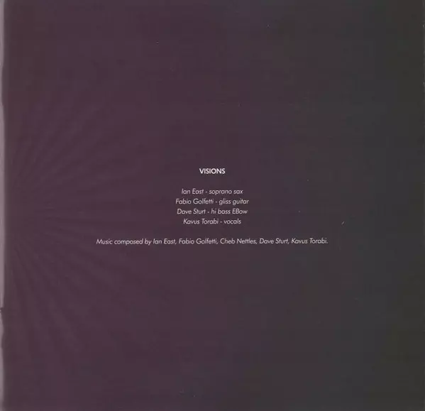 Bass, Keyboards Dave Sturt | Drums, Percussion Cheb Nettles | Guest, Duduk Didier Malherbe | Guitar [Gliss] Fabio Golfetti | Soprano Saxophone, Flute Ian East | Vocals, Guitar Kavus Torabi