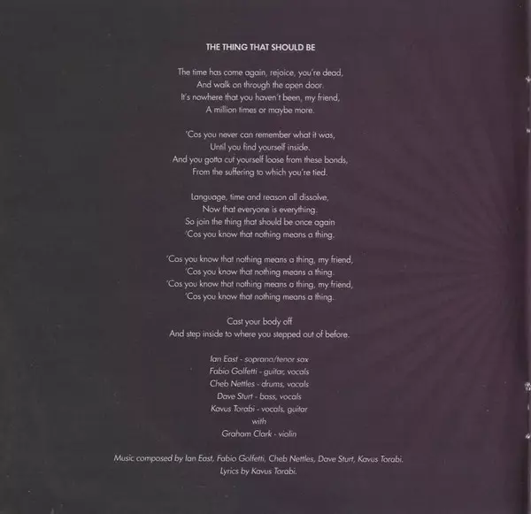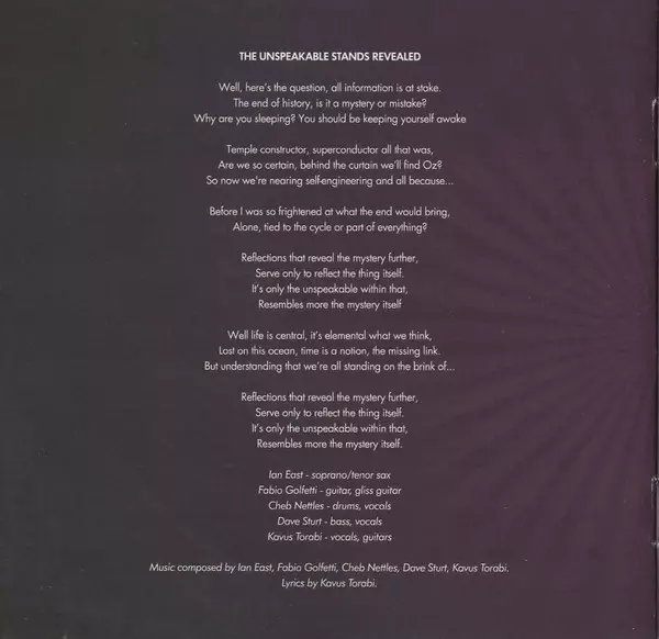 Bass, Vocals Dave Sturt | Drums, Vocals Cheb Nettles | Guitar, Guitar [Gliss] Fabio Golfetti | Soprano Saxophone, Tenor Saxophone Ian East | Vocals, Guitar Kavus Torabi