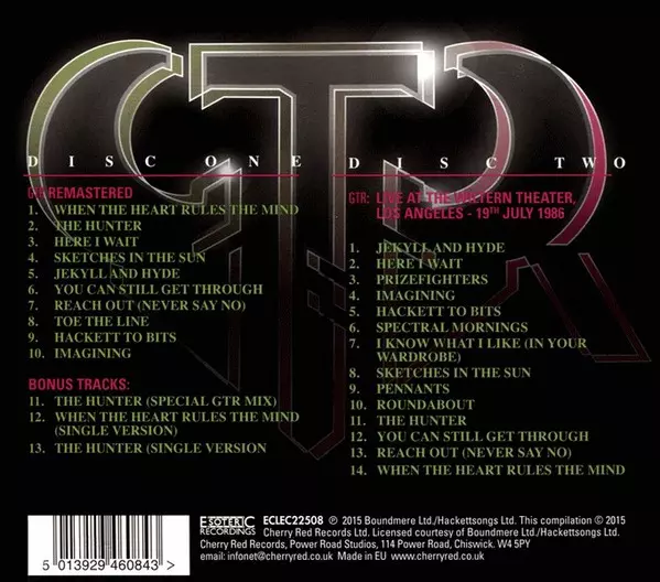 GTR: GTR DLX | DIGI verze na 2CD v remasterované deluxe digipack edici. Toto konkrétní vydání vyšlo v Evropě ve vydavatelství Esoteric Recordings dne 1. listopadu 2024. Album zasahuje do žánrů Rock, Progresivní rock, Art Rock a Arena Rock. Digipack Deluxe Edition.